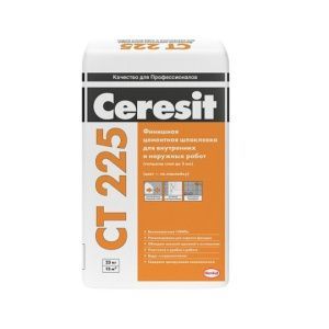 Шпаклевка финишная CT 225 от производителя Ceresit производится на основе гипса в сочетании с особыми химическими добавками. Эти добавки наделяют материал улучшенными свойствами. Так, например, армирующие волокна, добавляемые в состав штукатурки, делают ее намного более прочной. Материал имеет серый цвет, используется для отделки бетонных поверхностей. При этом шпатлевка не только выравнивает стены и потолки, но и заполняет все дефекты и трещины на них.